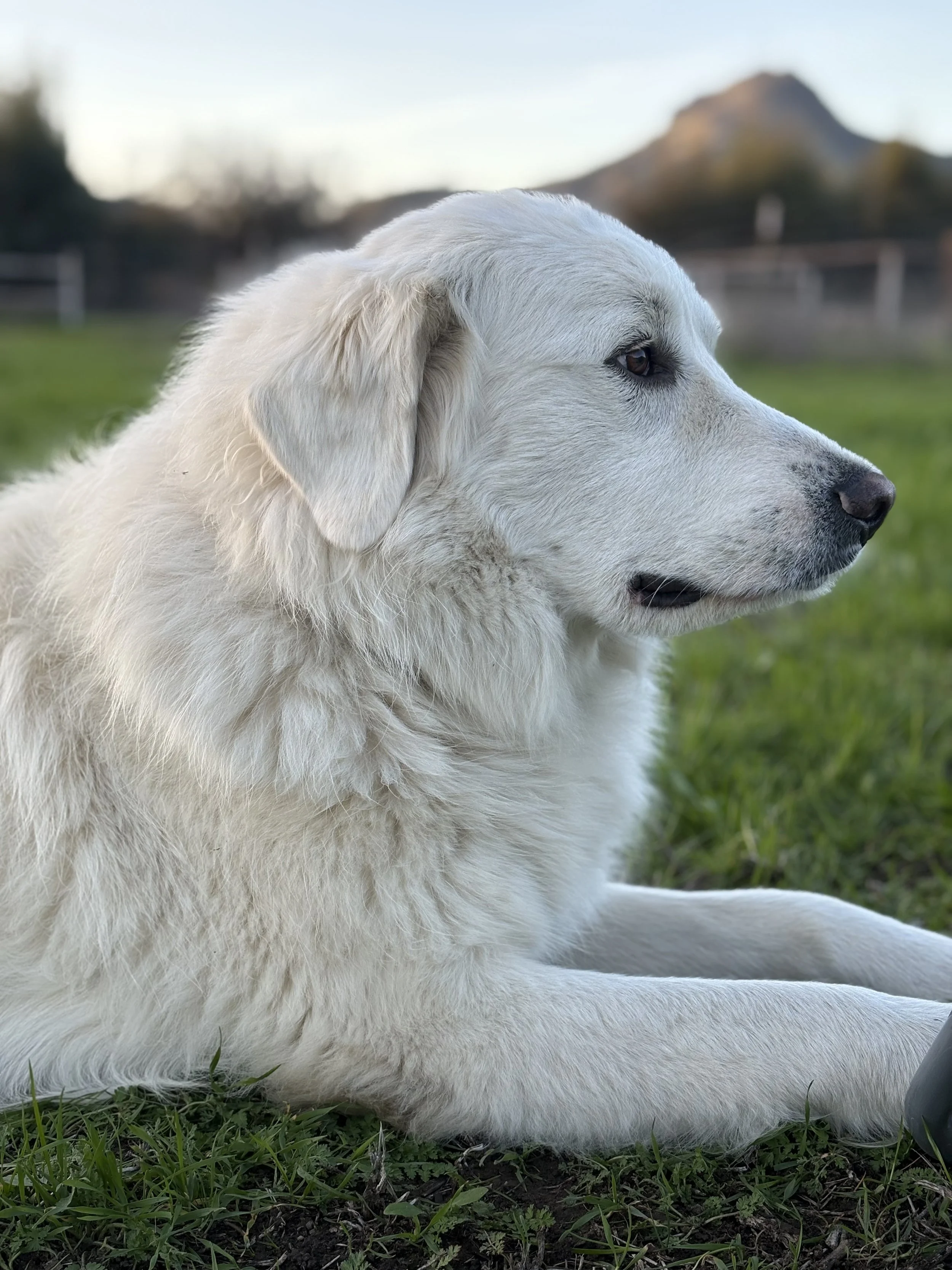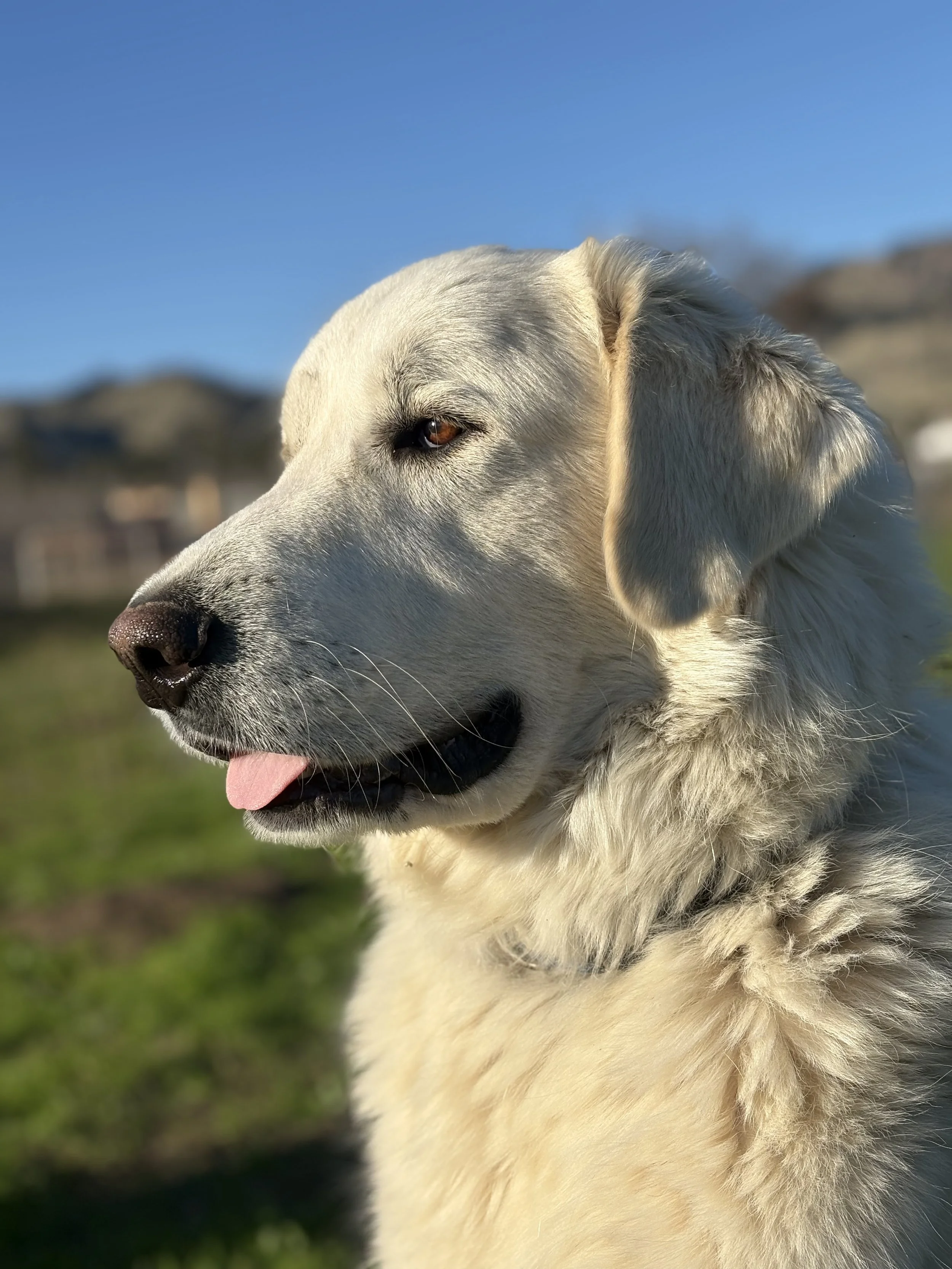 Frodo is our larger pup weighing 112 lbs! He is a purebred Great Pyrenees and loves to guard our property. Frodo is a gentle giant, with a wonderful temperment.